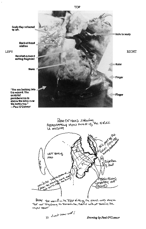 That's what "photo experts" like Robert Groden (in The Killing of a President, page 81) and Harrison Livingstone (in High Treason II) do. Wanting to show the back of Kennedy's head blown out and thus push the notion of a Grassy Knoll shooter they use a close-up autopsy photo of the inside of Kennedy's skull after the brain was removed. By rotating the photo ninety degrees clockwise, they can make it appear that the photo shows a large defect in the back of Kennedy's head. In actuality, Kennedy was photographed from the front, and the photo shows the top if his head blasted out, as shown in this drawing by Dr. Robert Artwohl. Finally, a large and properly-oriented copy of the head photo.