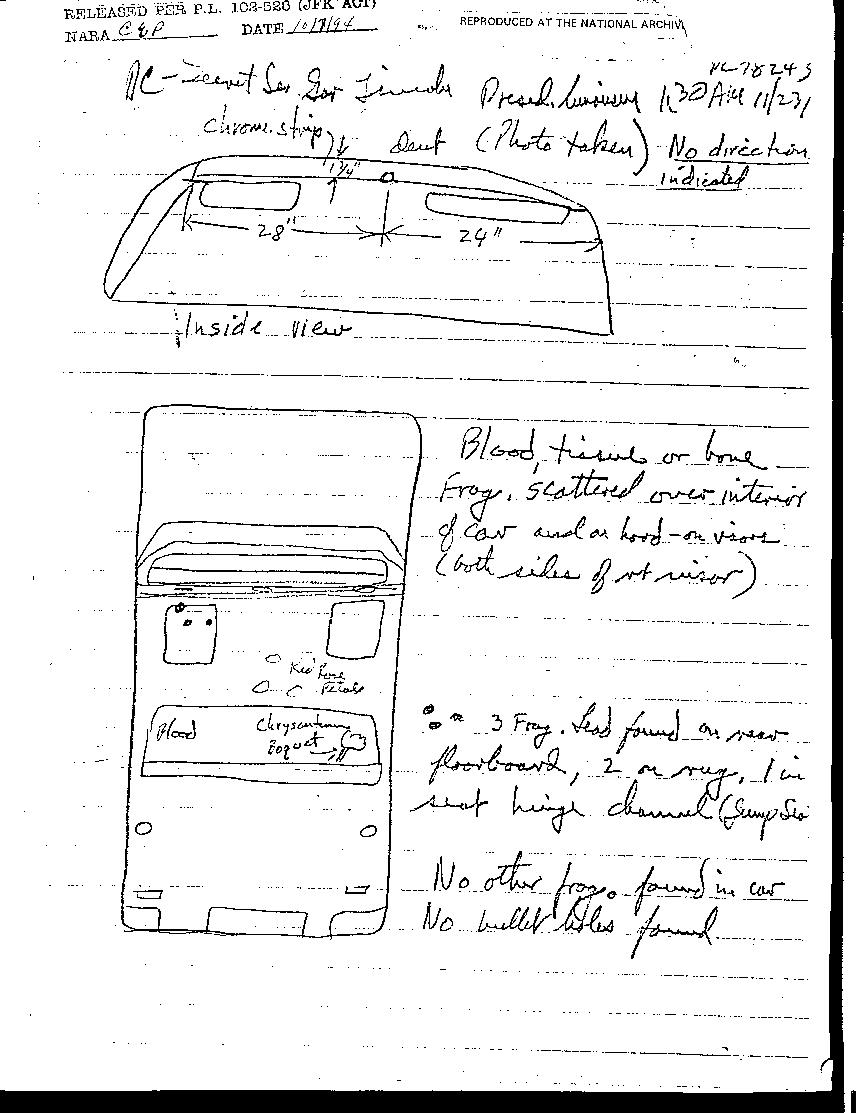 NOTE: (Blood drops appear on the windshield near the crack in CE 350 11/23/63 WR78. Also, what appears to be blood is visible on the windshield in 7HSCA385 (Figure 5). Chief Rowley of the Secret Service told the Warren Commission that "...the area around the (crack in the windshield) was splattered with debris." (CD80, p. 2)