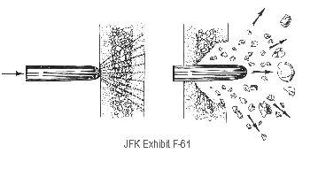 Key Concept: Beveling. When a bullet penetrates the skull bone, it will leave a small hole on the side from which it enters, and a larger dished-out crater on the side that it exits. The existence of beveling of the bone of Kennedy’s skull allowed the autopsists and later panels of forensic pathologists to establish that the bullet that hit Kennedy in the head entered from behind, with at least one large fragment exiting toward the front. See JFK Exhibit F-61, from the House Select Committee on Assassinations. |