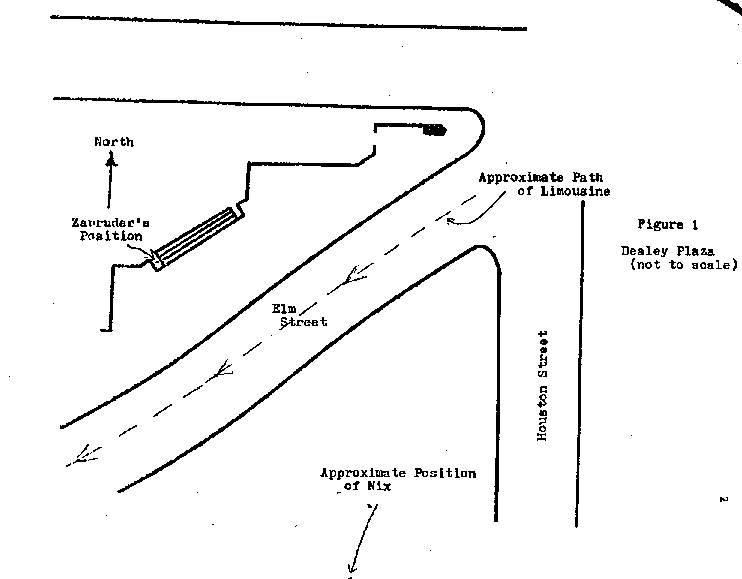 The photographic material delivered by the SCA included: (1) a 16 mm copy of the Zapruder film, (2) enlarged prints of selected frames of the Zapruder film, (3) prints of selected frames from the Nix film, and (4) a 1:120-scale map of the Dealey Plaza area. The movies were taken of the presidential limousine as it traveled southwesterly along Elm Street throtgh Dealey Plaza, Dallas, Texas. Figure 1 is a sketch of Dealey Plaza showing the route of the limousine and the locations of Zapruder and Nix. Zapruder's position is precise, but Nix's position is approximate.