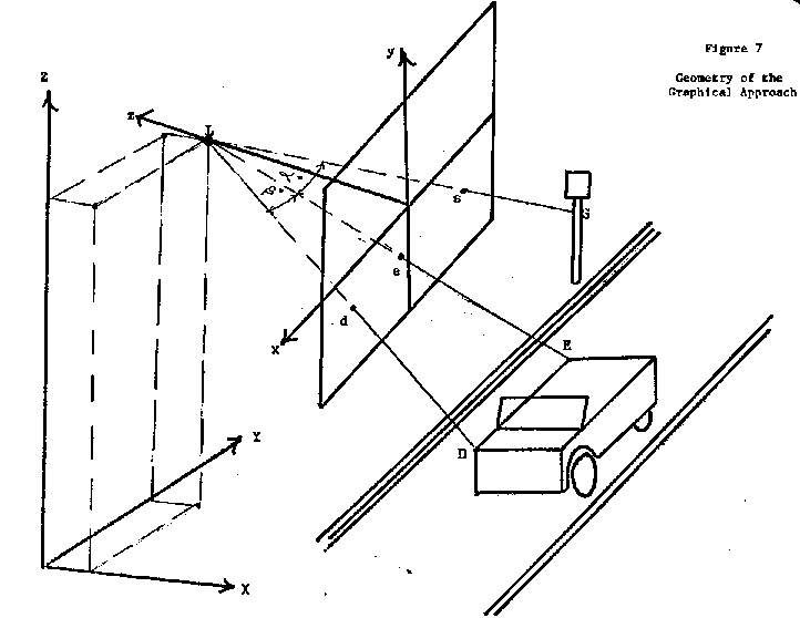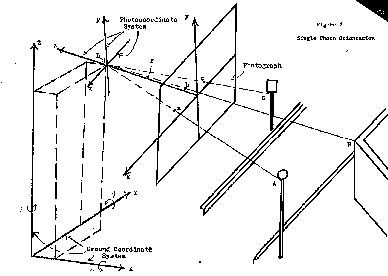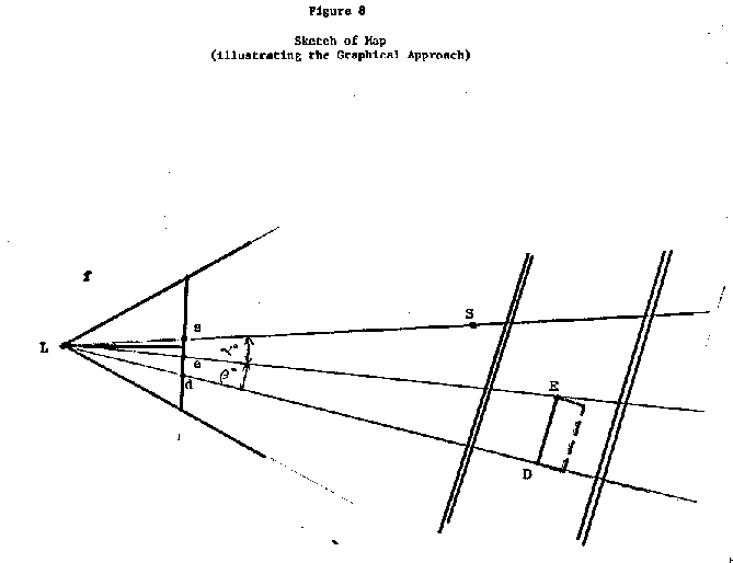 If only one object with known ground coordinates appeared in the photo, a graphical approach was used. Figure 7 illustrates the geometry involved in this graphical approach. L was the camera position (Zapruder). The photocoordinates of the street sign (S) and limousine points D and E were measured with the comparator. The principal point was determined by the same method described for the analytical approach, and, once again, became the origin of the photocoordinate system. Figure 8 shows a sketch of the map. Since the map positions of points L and S were known, the line from L to S was drawn with a straight edge. Because of the location of the points in the photo and the nearly horizontal angular attitude of the camera the angles a and b were assumed to lie in a horizontal plane with negligible error resulting.