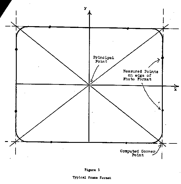 To convert comparator measurements to photocoordinates, two points along each of the four edges (fig. 3) were measured to define mathematically lines along the edges. Each pair of perpendicular lines were then intersected to obtain the photocoordinates of the frame corner. The intersection of the lines connecting diagonally opposite corners yielded the principal point (photo center) coordinates. Each of the measured photocoordinates of image points were then translated such that the principal point was the origin of the photocoordinate system.