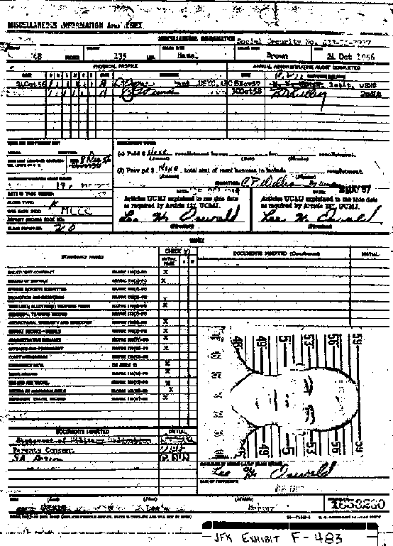 - October 25. 1956. U.S. Marine Corps miscellaneous information and index form (NAVMC H8 (1)-PD), signed Lee H. Oswald. Blue-black ink; nib pen. This document bears a second signature, reading Lee H. Oswald, dated October 28, 1956. blue-black ink, nib pen; and a third signature, reading Lee H. Oswald, dated May 2, 1957, black ink, nib pen. Location:DOD. (JFK exhibit F-483.)