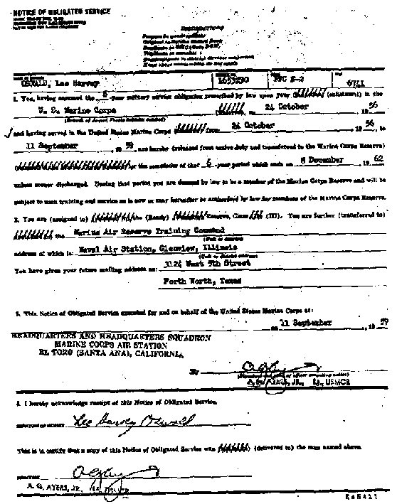 - September 11, 1959. U.S. Marine Corps notice of obligated service, signed Lee Harvey Oswald. Blue ink; ballpoint pen. Location:Archives. (JFK exhibit F-485.)