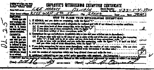 - October 16, 1963. Employee's W-4 withholding exemption certificate, signed Lee H. Oswald. Blue ink; ballpoint pen. Location: Archives. (FBI exhibit D-90; JFK F-501.)