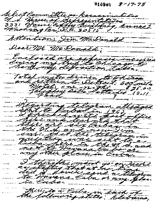 Regarding telegram alledged sent to Cuba in 1962. I checked with post-office here and learned that there are six Cubas in the U.S. and now I'm sure that the telegram in question was sent to a Cuba here in the U.S. and not to Havana Cuba or any other place in Cuba.