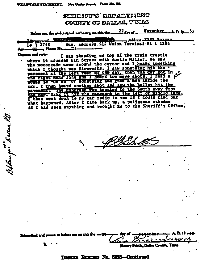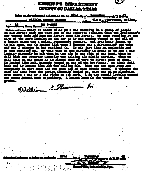 On many occasions since, I have stated that there were definitely three explosions, or shots (this while the F.B.I. was expounding its two shot theory), but during all of these years I have been troubled by the fact that the two subsequent explosions did not sound like that first clear sound of indisputable rifle fire, clear as a signal. I assumed that the difference might have been caused by the changed position of the car, or other movement.