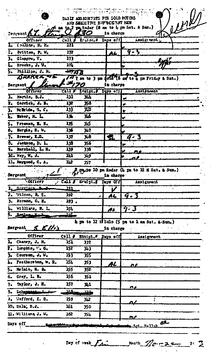 In connection with Groden exhibit No. 1 above, which portrays a motorcycle riding on the left side of the motorcade as it approaches Dealey Plaza from Main Street, the committee secured, through the cooperation of the Dallas Police Department, a copy of the daily solo motorcycle assignment log sheet for the week of November 22, 1963.