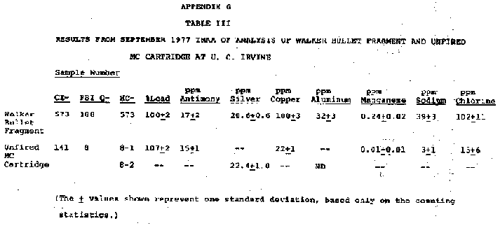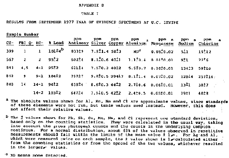 Dr. GUINN - Thank you, Mr. Chairman. I will just make one comment that I thought we might have brought out before, but we didn't quite get around to it. If any of you start looking at these detailed numbers, there needs to be a little further interpretation. First of all, some of the elements listed in my report, in our experience with all kinds of bullet leads often show up and often don't show up, and they don't seem to be characteristic of anything. Some of them are probably the result of external contamination. For the sake of completeness, I have included all of the elements detected, but I don't think that some of them contribute one way or the other to the characterization of source of the specimens. Also, when you look at the antimony and the silver values to see if these samples match these and these match these, it should be noted that the plus or minus that is shown after each of those numbers is merely the uncertainty of each value calculated from what we call the counting statistics. We can calculate that. The overall measurement uncertainty of that number on that specific sample is somewhat bigger than that, meaning that if we took that identical little piece and did the same experiment over and over again we would get about the same value, but the variation would be somewhat more than that calculated from the counting statistics--perhaps as much as twice larger. It depends on the value. And then, if you are trying to match this piece and this piece-which really both came from the same bullet but you don't know it and you are trying to prove it--you have to take into account another factor--how homogeneous is that bullet? Is every piece that you take from a bullet the same? And the answer is: No; they are not. The individual bullets are fairly homogeneous, but there are significant variations within them. We have a great deal of background data, specifically on WCC Mannlicher-Carcano bullet lead, that isn't in the report, but we use that as the backup which shows that the variation within a bullet is significant. So when you start to compare numbers, it turns out, for example, on the antimony numbers, roughly speaking, if you take the plus or minus that is shown and multiply it by about 6, that will take care of all of those variabilities within the sample, as well as the small measurement uncertainties. The variation within that individual bullet is then taken into account, and then you find out that two samples indeed match one another as closely as could be expected. For example, the CE-399 sample gave a measured value of 833 parts per million antimony, whereas the CE-842 sample showed 797. Well, any grammar school boy will tell you 797 is not the same as 833. But when you consider that the 833 is plus or minus about 50 and the 797 is plus or minus about 50, then you see that you can't distinguish one from the other. They are indistinguishable, but, by the same token, the other samples which are only about roughly 620 plus or minus a smaller amount, in that case about 20 or 30--they very clearly not only match one another, but they also widely differ from this 800 figure. But some of that is explained in the text of the report. You can't just take the numbers from the table and blindly go ahead; you have to read the fine print as well to see that everything is properly taken into account. In any event, though, I think the results have come out in a fairly clean-cut fashion. We didn't predict any particular way they would come out; they just fell out this way. And, as I say it led me to reexamine the FBI data more carefully than I had done earlier. I frankly was very surprised to see that even their data, somewhat fuzzier, et cetera, still fell right into the same picture. So I think the conclusions are well established. Also, as I have stated earlier, fortunately by using this method one does not destroy the samples. The identical samples are still there. They weigh the same; they can be analyzed all over again. All of the radioactivity that we induced in them a year ago has long decayed out, so they could readily be analyzed over again, if desired. Other than that, I just want to say it has been a real pleasure working with the committee and with the staff of the committee, and I thank you very much for inviting me here.