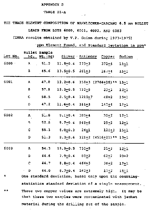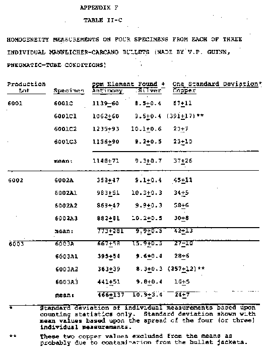 Dr. GUINN - They are definitely unhardened bullets. That puts them down much lower in antimony than most bullets. Subsequently we--in looking at a lot more brands in the interim-did find some others that were also low, some of them lower yet in antimony, but that was one unusual feature. The other unusual feature of the WCC Mannlicher-Carcano is that there seems to be no uniformity within a production lot. That is, even when we would take a box of cartridges all from a given production lot, take 1 cartridge out and then another and then another and then another, all out of the same box--boxes of 20, these were--and analyze them, they all in general look different and widely different, particularly in their antimony content. This is not true of most bullet leads that we have ever looked at before, which are very uniform. In general, if you take most boxes of ammunition--and we published on this; it is in the literature-take a bunch of them out, you can't tell one from the other. They all look like little carbon copies even to activation analysis, but not so with the Mannlicher-Carcano.