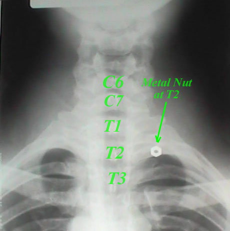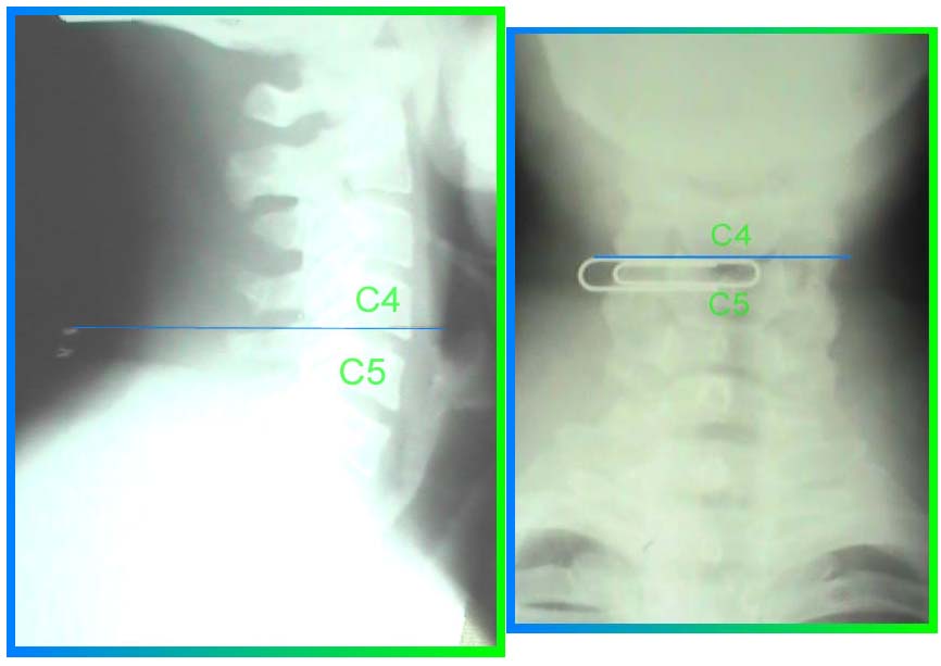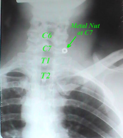 In order to start properly, I palpated the most prominent vertebra in my neck, or upper back. I placed a lead weight on the spot, taped it, and took one AP and one lateral cervicothoracic (CT) x-ray to identify my most prominent vertebra. See below: