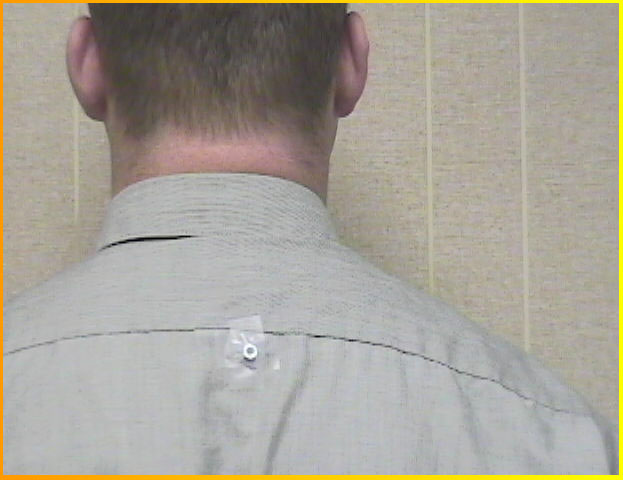 The metal nut is seen at C7, not T1, 2 or 3. Interestingly enough, if you looked closely, my shirt 'bunched' up just below the collar. Why? Simple. When you elevate your shoulders, the fabric lying on top moves, too. The collar is a thicker portion of fabric that is creased and folded down. The shirt fabric, when elevated in such a manner, is 'pushed down' (for a lack of a better phrase) by the collar's bottom edge and a fold of 'bunched' fabric is created. See the following video clip by clicking here. Now, next time you are talking to someone who is wearing a dress shirt and tie or a sport coat, and they are sitting, take note to what the fabric is doing. Chances are that you'll see the 'bunch' phenomenon happen before your very eyes- you just never noticed it before. You can also witness this during just about any movie at Hollywood Video or Blockbuster.