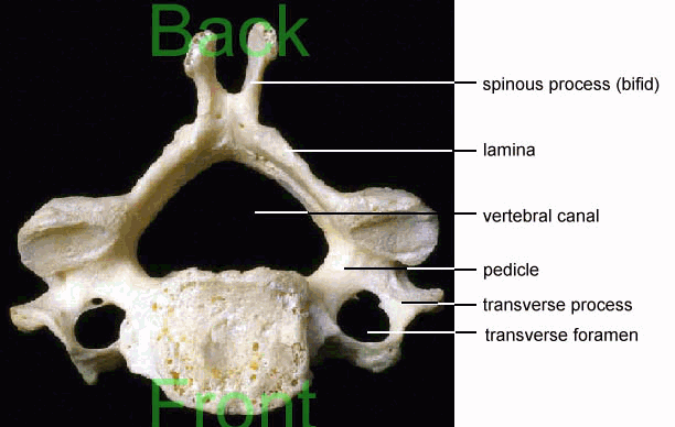 The cervical vertebrae are unique in their structure. They have two unique, identifying features. First, they have a 'bifid spinous process'. 'Bifid' means that the spinous process is divided into two 'clefts'. The second unique feature is the 'transverse foramen'. This is an opening in the 'transverse process' that allows passage of a small artery called the 'vertebral artery'. This artery is an ascending branch of the subclavian artery. It passes through the 'transverse foramen' at the sixth cervical vertebra, travels upwards across the posterior arch of the first cervical vertebra, enters the skull and joins the other vertebral artery, forming the 'basilar artery'.