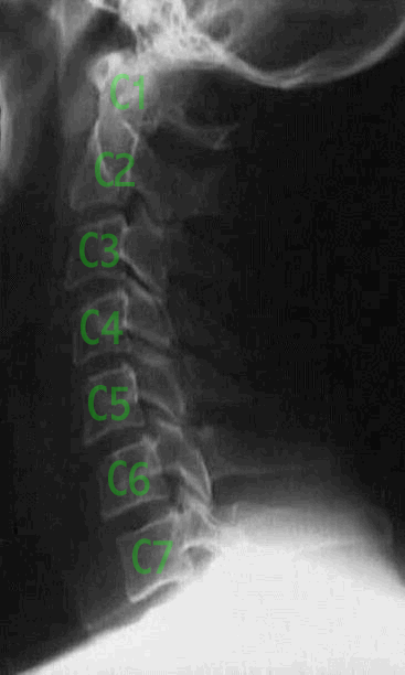 The illustration to the right is of a textbook normal cervical spine. It consists of seven cervical vertebrae and has the normal curve, or 'lordosis'. Lordosis is a medical term derived from the Greek 'lordos', meaning 'bent backwards'. In medical use, it means that the convexity is to the front. In other words, if you were to draw a line through the center of the vertebra starting at C1 and going to C4, as well as a line from C7 to C4, they would converge at a point towards the front in reference to the starting points- C1 and C7. A lordosis, in lay terms, is a curve towards the front.