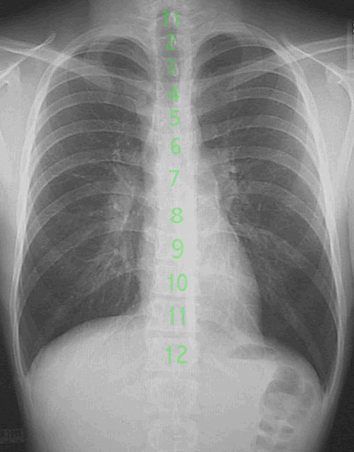 The thorax, or the area between the first and twelfth thoracic vertebrae, consists of 24 ribs, 2 clavicles, 2 scapula, 12 vertebrae and the sternum. Of all of these bones, the scapula has the greatest freedom of movement. It's only articulation is at the shoulder where it forms the glenohumeral joint and the acromioclavicular joint. Since the shoulder does not form a joint near the middle, it has less natural restriction in movement. Therefore, the position of the scapula can vary greatly. However, we can assess some common reference points with a person in a neutral, relaxed position.