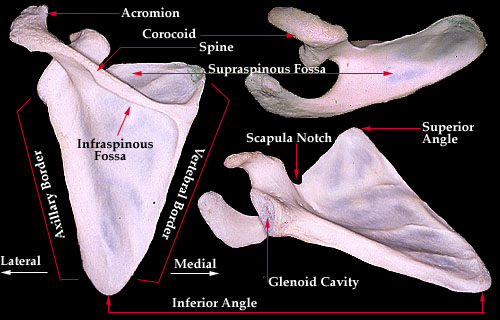 The scapula is a triangular shaped bone on the rear portion of the thorax. It overlies the rib cage and covers parts of the 2nd to 7th ribs. It connects the clavicle, or collarbone, to the upper arm. This forms the shoulder girdle. The shoulder joint has the greatest freedom of motion of any joint in the human body. This freedom of movement comes at the expense of the joint's laxity and instability.