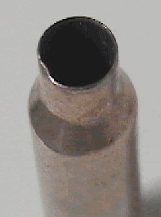 A live rifle shell, or cartridge, is a very simple device. It consists, usually, of a brass casing such as the one above. The casing has a primer attached to the base that provides the ignition to the explosive gunpowder within the casing. The bullet is 'seated' in the case and the case is crimped, or tightened, around the bullet. The firing pin of the rifle impacts the primer. The primer fires due to the compression created from the firing pin 'punching' the metal base of the primer. This ignites the powder and creates a very fast expansion of gases. That expansion is powerful enough to push the 'seated' bullet from the casing. The bullet continues to be pushed as the gases expand, developing velocity over the length of the rifle barrel. This is a very, very simple concept.