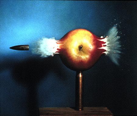 A bullet passing through the center of an apple. Any movement is reduced due to the lesser density of the apple. Shooting a block of wood would be dramatically different.