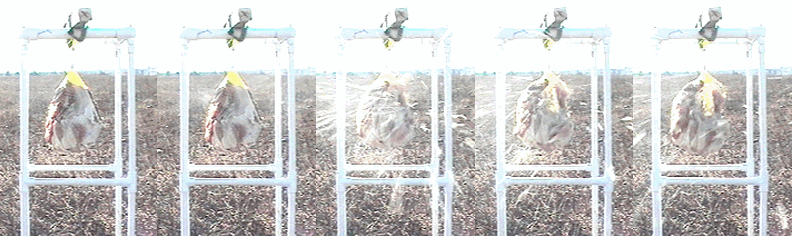 The second frame shows the entrance and exit of the bullet. The turkey breast has not moved. The remaining frames show the explosion of the soft tissue, pushing the turkey breast towards the left, or towards the shooter.