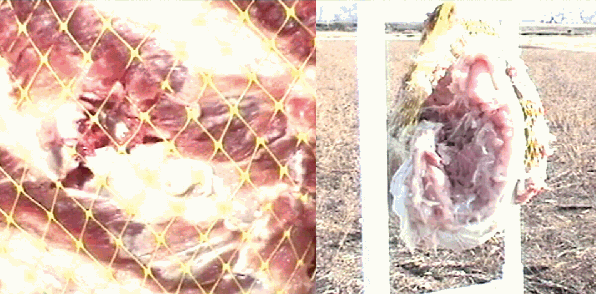 As the picture sequence shows, the bullet traverses the entire ribbed turkey. The third frame shows the expansion and explosion of tissue that occurs as the pressure cavity 'releases'. By looking at the left border of the white PVC 'hanging rack', You can see that the first observed motion is towards the shooter, not away. This bullet hit the top portion of a rib bone before going through the turkey. This creates more dispersal of energy and a more forceful pressure cavity explosion. See the damage to the 'ribbed turkey' below. Click here for a video showing what happens when a rib is NOT hit.