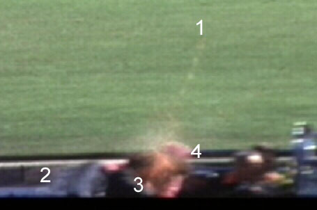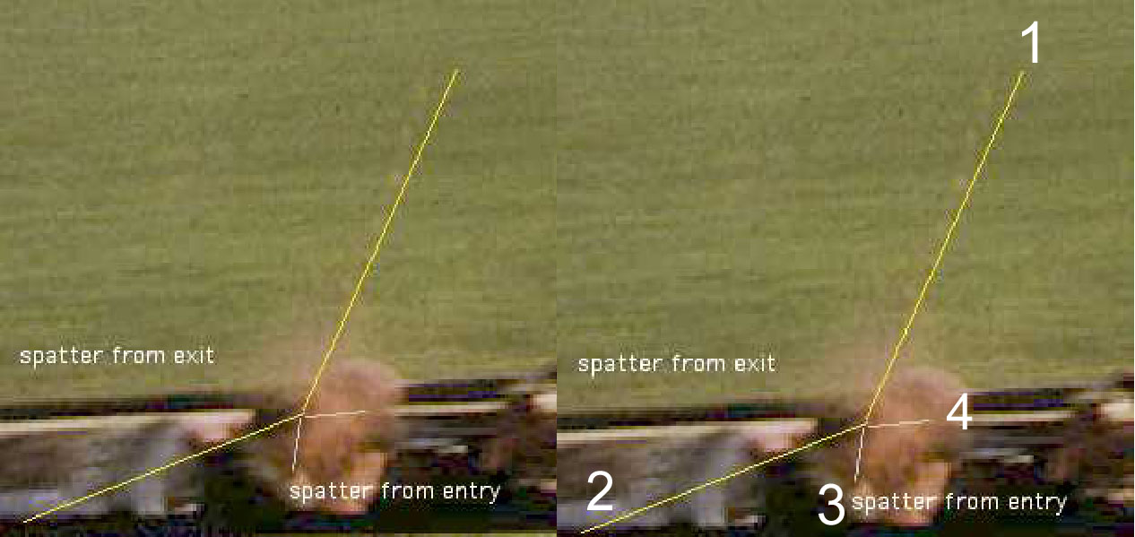 In the above illustration, you will see Sherry's defined entry and exit cones. I have taken the liberty to label the lines with numbers for easy reference. Line 1 correlates to the 'white streak'. Line 2 is the second border of the exit cone. Lines 3 and 4 are defined from a 'triangle' formed from the extrusion of tissue and blood just above and in front of Kennedy's right ear, where the 'flap' of bone is located. Below is a different version of frame 313 captured from DVD. It is labeled with the numbers in about the same place, but without lines drawn in.