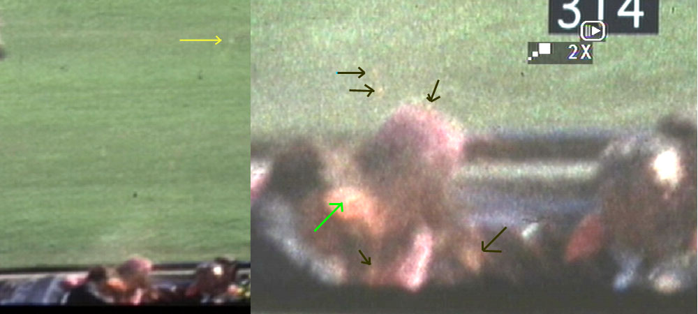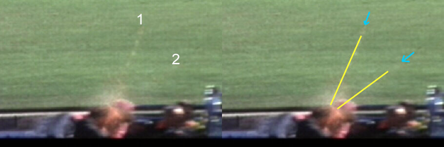 Frame 313 is not extremely clear. There is a lot of fast moving debris and the panning of the camera creates a little blur. But, when seen in motion, there are two streaks of ejected debris. Not one. When you watch the negative enhancement, it becomes clearer. It is a very fast streak that is only seen in frame 313 because it either rapidly dissipates by 314 or is out of frame. Watch the negative enhancement here. You need to watch closely.