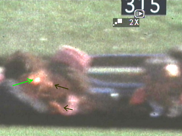Frame 314 is very interesting. Again, we see nothing much to the rear of President Kennedy. The yellow arrow is likely a considerable fragment of bone that is visualized in frame 313 as the top of the 'white streak'. In this frame, we see the emergence of the 'bone flap' (green arrow) that creates the margin of Guiterrez's entry cone. The other black arrows illustrate pieces of debris that are 'in transit'. Most debris is seen in front of Kennedy. But, since the spatter went in "all directions" this is easily explained as forward or back spatter. It's speed is slow, making it consistent with back spatter. And, since forward spatter may have high velocity debris, there is also slow velocity debris. It could be either.