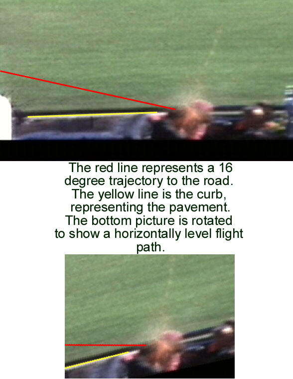 As much as I would like to take credit for this find, I cannot. Perceptual researchers Paul Seaton and Steve Barber noticed something in the MPI digital remake of the Zapruder film that stunned them, and myself. It appears, to me at least, that what is visualized is a fragment of bone ejected from the front, parietal area of Kennedy's head. It can be seen emerging from the wound in frame 313 as the right side of Guiterrez's entry cone. It is seen in flight in frame 314. When Zapruder filmed the assassination, the camera panned upwards a tiny bit, taking the lower margin of the top of the car out of the frame. Because of this, you cannot see into the car for a few frames, then he lowered the camera again. What was captured is both gross and amazing. Click here to see the video sequence. I highlighted the bone fragment in the video. It actually appears about 2 frames before my highlights of the bone appear. I did not notice that until I had completed the video editing. Watch closely. Roses are Red, Violets are Blue. Roses don't bounce and tumble, but parietal bones do!