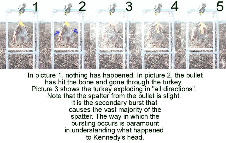 So, the bursting of the skull in frame 313 is not quite as pretty as a picture of a bullet through an apple. Other things have taken place. The bullet has already entered and left Kennedy's head. This impact and transit causes a pressure cavity in the soft tissue of the skull. Since the skull was severely fragmented, the pressure was released through the areas of lease resistance. You see the top right of Kennedy's head explode. Does that mean that's exactly where the bullet came out or went in. No. It is the pathway of least resistance caused by the fragmentation of the skull...caused by the bullet. It's not as simple as you may think. What Sherry Guiterrez is looking at in 313 is NOT the same as the picture of a bullet going through an apple. The little bursts of blood from the entrance and exit of the bullet are not seen. You see the explosion of the pressure cavity through the areas of least resistance. Unfortunately, this was not in the back of the head. Also, please note the multidirectional capability of the exploded tissue above. It went everywhere, including quite a bit on the camera itself. The bullet traveled from left to right in the above picture sequence. See below for an alternate explanation/illustration.