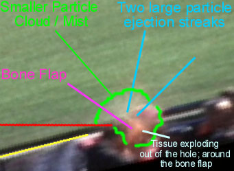 Frame 316, captured from DVD, shows fairly good sized chunks of brain tissue (most likely). These are easily seen and some are highlighted with the black arrows. Now, you have to ask a very important question. Exactly how much of the 'entry cone' is defined by margins created by the bone 'flap', highlighted in yellow? Is the entry cone a true spatter cone, or a cone created by the bone flap?