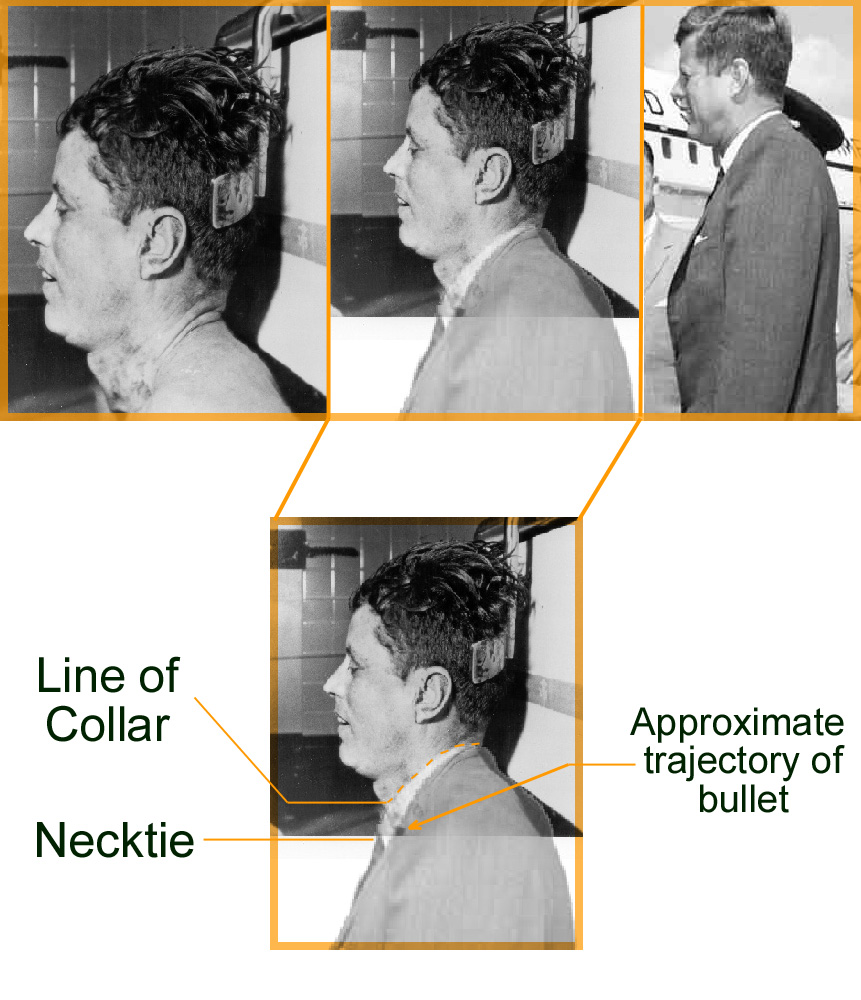 Using a compilation of photographs, the left profile autopsy picture can be 'fitted' with a suit from a left profile photo of President Kennedy. Then, we can draw a line through the wound track to illustrate the approximate path of the bullet through the base of Kennedy's neck, or upper back, through his shirt collar and the knot of the tie (assuming that the tie was nicked, which is still under debate). Now, as you can see, the approximate location of the back/neck wound is still too high on the fabric to be explained by the President's back contour. However, if the shirt and coat were nearer to the C4 level as suggested by anatomical analysis, then only a short distance must be accounted for. This is the "Bunch Theory".