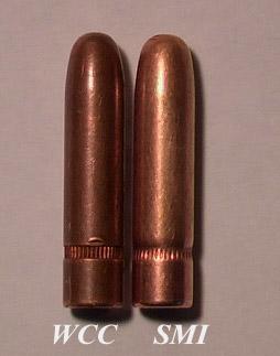 The base comparison shows the jacket thickness to be about the same. However, I have noticed that the SMI bases differ slightly. The jacket has an indented lip on the base in contrast to the WCC bullet's apparent flat jacket base. The opening of the SMI rounds does tend to differ from bullet to bullet. I do not have enough WCC rounds to make a similar comparison.